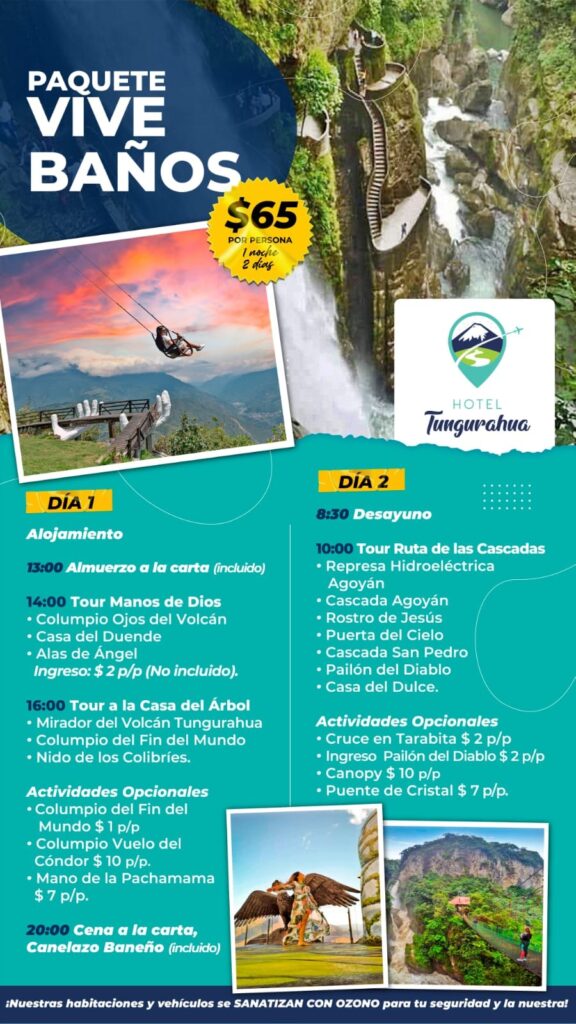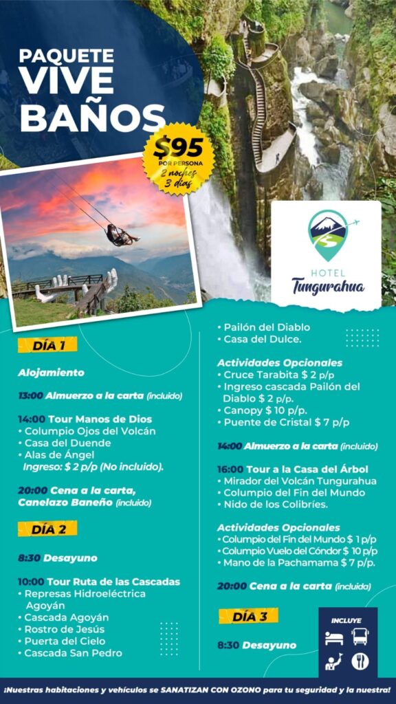 Mi estancia en el hotel Tungurahua fue excepcional, con un servicio impecable. El restaurante ofreció delicias culinarias e inolvidables. Las actividades extremas fueron adrenalina pura y seguras ¡Una experiencia que superó todas las expectativas!